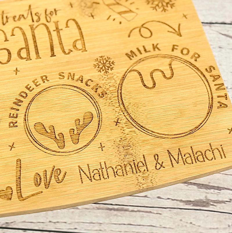 - Laser engraved bamboo board with dedicated spots for cookies, reindeer snacks, and milk